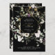 Este maravilhoso convite para o casamento apresenta um buquê espalhado de lindas e delicadas flores silvestres em verde-sábio claro, esticado e roxo, com sotaques geométricos de ouro falsos e caligrafia em um fundo preto dramático. Um design elegante e humorístico com um padrão de coordenação enchendo a parte traseira do cartão.