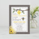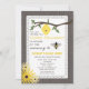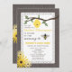 Um convite de chá de fraldas com um fundo de madeira inspirado em ambos os lados. A frente tem um centro inspirado na ilustração de um ramo de árvore com colmeia no topo. Ilustrações de suspiros de olhos negros no fundo. Ilustração da abelha de mel com texto personalizável. O lado oposto tem uma faixa inspirada em renda e flores silvestres com texto "é uma garota!" Procure itens correspondentes na Paperie da Jill.