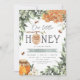 Os convites de festas de aniversários de criança brancos e bonitos apresentam uma borda de folhagem botânica verde, flores brancas cor de laranja, favos de mel e um pote de mel com abelhas buzinas. "Nosso pequeno mel" aparece no topo, com seus detalhes de festa de aniversário embaixo de uma letra de cinza macia. Exemplo mostrado para uma terceira festa de aniversário.