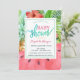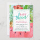 Um convite de chá de fraldas bonito apresenta folhas de palma, melancia e abacaxi em fundo azul. Esses convites para chuveiros de bebês são facilmente personalizados para seu evento simplesmente adicionando seus detalhes.