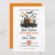 Os convites da festa Melhor Festa de Halloween apresentam o Casle Incantado com morcegos assustadores. Texto personalizado em laranja e preto.