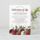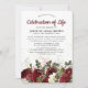 Um convite para o funeral "Celebração da Vida", desenhado com um fundo branco clássico, um conjunto de flores de burgundy e de aquarela branca com folhagem botânica verde e outra e um modelo de anúncio elegante e memorial que pode ser facilmente personalizado.