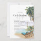Este convite fúnebre/memorial "comemoração da vida" apresenta um par de cadeiras de praia/pavimento na mesa de praia sob o guarda-chuva branco com palmeiras. O verso apresenta padrões geométricos em azul-indigo. Personalize-o para as suas necessidades. Você pode encontrar mais produtos correspondentes na minha loja.
