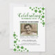 Um convite para o funeral de homenagem irlandês, que inclui um clássico fundo branco com os tradicionais trevos de shamrock verde irlandês, uma fotografia do seu amado e uma celebração do modelo da vida que pode ser facilmente personalizado.