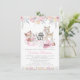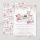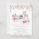 Convite de chá de bebê menina floresta com doces animais da floresta em um fundo floral em aquarela rosa pastel e dourado. Este convite de chá de bebê menina floresta é facilmente personalizado para o seu evento, basta adicionar seus detalhes. Você também pode adicionar uma cor de fundo na frente e atrás.