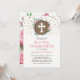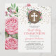 Convite rústico para a primeira comunhão com um fundo branco simples que pode ser alterado para qualquer cor, um barril de madeira rústico, um design floral de rosa cor-de-rosa, brilho cintilante dourado e um modelo de comunhão religiosa moderno e fácil de personalizar.