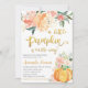 O convite inclui uma abóbora laranja com flores rosadas e laranja. Este design é perfeito para um chá de fraldas com tema de queda.