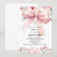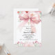 Um fundo branco, decorado com um grande laço rosa e, uma cruz dourada e flores rosa. Personalize e adicione um nome e detalhes detalhes.