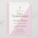 Parabéns na primeira comunhão do seu filho. Este evento é algo que deve ser apreciado e celebrado. Eu desenhei este convite moderno de 1rua usando detalhes falsos de ouro e tipografia com sotaque cor-de-rosa triangular. Um guião elegante, uma cruz impressão dourada e um modelo fácil de usar, personalize este convite para o dia especial da sua filha. Inclua seu nome e detalhes do evento. (altere a cor usando a ferramenta personalizar, se necessário)