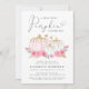 Um convite para chás de uma menina bonita, alegre e bonito, com "A Sweet Little Pumpkin Is On Her Way" escrito em uma mistura de tipografia moderna de cinzas moles e roteiro de na moda com um inchaço cardíaco, e uma aquarela de abóboras cor-de-rosa e brancas e flores cor-de-rosa com sotaques dourados. Personalize facilmente o nome da mãe e os detalhes do chá em uma simples tipografia moderna de cinzas suaves.