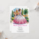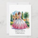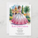 Uma ilustração ao estilo aquarela de uma jovem em um vestido de quinceañera ornamentado em frente a um prédio ao estilo colonial espanhol. O vestido é branco com uma saia de cheio dramática decorada com padrões florais cor-de-rosa ao longo da barra, apresentando um corpete rosa com capas de boné curto. Seu cabelo está estilizado em uma lua elegante com acessórios cor-de-rosa, e ela veste brincos cor-de-rosa. O fundo mostra um prédio amarelo e vermelho com portas arborizadas, torres domadas e detalhes arquitetônicos espanhóis. A paisagem inclui ciprestes altos, palmeiras e plantas do deserto. O céu é pintado com aquarela azul macia com nuvens sabedoras. A ilustração tem uma qualidade sonhadora e romântica com bordas suaves e transições de cores suaves. O chão mostra um caminho de pedra, e a paleta de cor geral consiste em amarelos, pintas, verdes e blues macios.