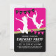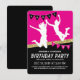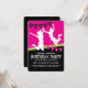 Convites de festa de aniversário do parque de trampolim com um fundo rosa e preto, uma faixa de brilho dourado falso, crianças pulando e voando pelo ar e um modelo de texto simples.