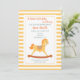 Uma garotinha - ou menino - está a caminho! Vamos chá a futura mãe! Este mínimo mas atrativo convite para o chá amarelo-bebê é perfeito para a ocasião. Ele apresenta um cavalo de balanço antiquado em amarelo e laranja decorado com pequenos corações. No verso, há um grande coração e listras amarelas. Esta menina - ou rapaz - modelo de convite para chá pode ser facilmente personalizada com os detalhes do seu chá de fraldas, e você pode alterar a fonte, o tamanho ou a cor de qualquer texto.