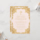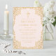 Este convite de primeira comunhão rosa e dourado com um ar vintage, recomendado para uma menina, tem uma moldura ornamentada em folha de ouro falso com ramos sinuosos com folhas douradas sobre um fundo rosa pálido. Acima do texto há uma cruz religiosa em folha de ouro falso. Todo o texto pode ser personalizado e tem uma cor amarelo-dourado semelhante à moldura de ouro falso.