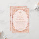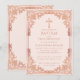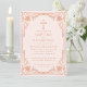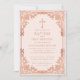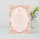 Este convite de batizado e primeiro aniversário em rosa-choque e dourado-rosa com um ar vintage, recomendado para menina, tem uma moldura ornamentada em folha dourada-rosa (falso) com decorações barrocas elegantes sobre um fundo rosa-choque. Acima do texto há uma cruz religiosa em dourado-rosa. Todo o texto pode ser personalizado e tem uma cor semelhante à moldura dourada-rosa.