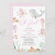 Rapariga rosa moderna sob Chá de fraldas marinho Convite Meninas bonitas sob o tema do mar apresentando várias criaturas marinhas como uma baleia e polvo e um título de caligrafia moderna rosa que diz "oh girl". Este convite para chás de fraldas é ideal para um chá de fraldas temático submarino.