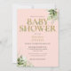 Um convite de chuviro de bebê elegante com tipografia dourada elegante e folhagem verde botânica bonita em um fundo rosa bege. Criado por Thisisnotme©