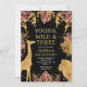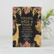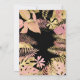 Este terceiro convite de aniversário da "jovem, selvagem e três" safari da selva, com o tema da menina, apresenta folhas falsas de ouro (girafa, leão e macacos), folhagem dourada e rosa da selva, e uma aspersão de confete de ouro sobre fundo preto. Adicione o nome da aniversariante e os detalhes da festa em texto em ouro e branco. No verso aparece um padrão de quadros coordenadores de folhas cor-de-rosa e douradas.