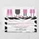 Um convite de festas de aniversário de sono com uma ilustração de quatro pares de pés vestindo flamingo, urso, gato e sapatilhas de coelhinho. Os pijamas têm um esquema de cor rosa e cinza. O fundo é a impressão em zebra. Personalize o texto.