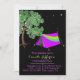 O convite de aniversário de camping feito a preto com uma tenda cor-de-rosa neon e uma árvore com luzes cintilantes. Personalize todo o texto para a festa de óculos da sua filha.