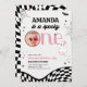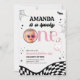 Retro Pink Black Girls Spooky One primeiro aniversario Invitation Halloween spooky um temed convite de primeiro aniversário para uma menina com um fantasma ranzinza, algumas teias, morcegos, aranhas, estrelas e texto retrô em preto e laranja. Este convite de primeiro aniversário assustador também apresenta uma onda como o padrão de tabuleiro de xadrez e é ideal para uma primeira festa de aniversário de outubro para uma menina.