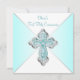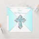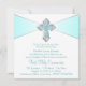 Convite de Primeira Comunhão azul turquesa para menina com elegante cruz de diamante azul turquesa e prata em um belo fundo azul turquesa. Você pode personalizar facilmente este convite de Primeira Comunhão azul turquesa adicionando os detalhes do seu evento no tamanho e cor da fonte e na redação de sua escolha.