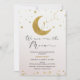 Meninas Rosa Douradas Estamos Sobre O Chá de fraldas Lua Convidando Meninas Docas de ouro e lua rosa convite para chás de fraldas com lua dourada falsa, estrelas e texto de caligrafia moderno.