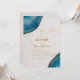Este elegante convite para batismo, recomendado para batizar um menino, tem geodes azuis agados nos cantos superior esquerdo e inferior direito. O fundo é mármore branco. Há uma cruz de ouro sobre o texto. O nome do bebê está escrito em uma escrita caligráfica elegante, o restante em bonés. Todo texto tem uma cor de ouro, semelhante à cruz dourada.