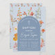Um design floral para o batismo de um bebê. O texto é branco, com uma cruz na parte superior, dentro a um arco azul rodeado por flores silvestres pintadas em aquarela sobre fundo azul claro. O nome está escrito em script. A informação está em duas colunas, separadas por uma linha. No verso, há um padrão das mesmas flores silvestres sobre fundo azul. As flores silvestres são ilustrações botânicas de Margaret Armstrong (1867-1944), do "Field book of western silvestre", publicado em 1915, agora no dominio público.