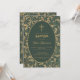 Este elegante convite batismo com ar vintage, recomendado para batizar um menino, tem um quadro de ouro vintage com folhas de palha de ouro em espiral e algumas decorações de flores com palha verde-escura. O texto é dentro e oval com ouro e tem uma cruz de ouro sobre ele. O nome do garoto está escrito em um roteiro caligráfico elegante. Todo texto pode ser personalizado e tem uma cor de ouro semelhante à decoração dourada do quadro. No verso, há as mesmas decorações douradas. O pano de fundo com sua elegante decoração de ouro em verde-escuro é de um cobrir de livro antigo, de Albert Angus Turbayne, para o livro "A Dama do Lago" de Sir Walter Scott, publicado em 1898.