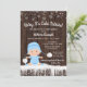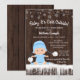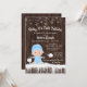Convites de chuveiro de bebê de inverno para meninos com adorável bebê vestindo um traje de neve azul bebê com chapéu em um fundo de madeira rústica e flocos de neve. Esses convites de chuveiro de bebê de flocos de neve de inverno são facilmente personalizados para o seu evento, basta adicionar seus detalhes. Este design funciona bem para um convite de revelação de gênero de floco de neve ou inverno.