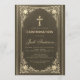 Este convite de confirmação elegante com um ar vintage tem uma moldura dourada vintage com elegantes decorações barrocas em ouro sobre um fundo semelhante a couro preto. O nome do menino é escrito em uma fonte caligráfica elegante. Todo o texto pode ser personalizado e tem uma cor dourada semelhante às decorações douradas da moldura.