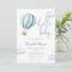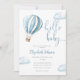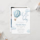 Este convite de chá de bebê encantador apresenta um lindo balão de ar quente azul e nuvens, juntamente com uma tipografia elegante. Com o código QR do seu registro e foto especial no verso. Projetado por Thisisnotme©