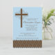 Nosso belo convite para o batismo azul rico ou batizante convite para o batismo de um garoto apresenta uma delicada cruz marrom com uma borda de renda marrom sobre um fundo azul claro. O nosso convite apresenta uma impressão frente e verso correspondente. Visite o nosso compro para este convite numa grande seleção de cores modernas e tradicionais e para ver a nossa seleção de convites religiosos para rapazes, incluindo convites para comunhão.