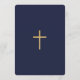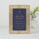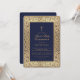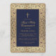 Este elegante convite para a primeira comunhão floral com ar vintage tem um quadro de ouro floral de condecorações intrincadas de rosas selvagens sobre um fundo azul marinho. Todo texto pode ser personalizado e tem uma cor de ouro semelhante às rosas douradas no quadro. Acima do texto, há uma cruz de ouro. As palavras "Primeira Comunhão Sagrada" são escritas num guião caligráfico elegante. No verso, tem uma cruz de ouro sobre fundo azul marinho. O quadro de rosas de ouro é de um cobrir de livros antigos, de 1912, de As Obras Políticas Completas de Geoffrey Chaucer, agora no dominio público.