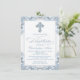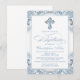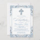 Convite de batismo azul para meninos com linda cruz de diamante azul e escrita elegante em um lindo fundo azul bebê e branco. Este convite de batismo azul elegante é facilmente personalizado para o seu evento, basta adicionar seus detalhes no estilo de letra e cor, e na redação de sua escolha.
