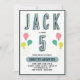 Este belo convite de aniversário para crianças 5 modernas com tema de transporte apresenta ilustrações coloridas de balão, tipografia amigável para crianças, e um fundo branco com um toque de verde escuro. Personalize-o com o nome e a idade do seu filho. Originalmente projetado para 5, você pode facilmente editar a idade em 'personalizar este modelo' para uma comemoração diferente!