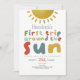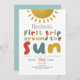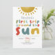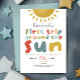 Este primeiro aniversario de convite para designs, bonitinho e caprichoso, apresenta um sol, com o texto "primeira viagem ao redor do sol", e pode ser personalizado com toda a informação que você precisa para a primeira festa do seu filho em tipografia bonita e colorida. O convite também apresenta um sol e um céu azul iguais nas costas. Os convites brilhantes perfeitos para o seu primeiro aniversário!