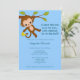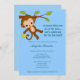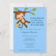 Tem um bonitinho macaco balançando num galho. Apresenta sombras do tema de cor AZUL. Este convite ao chá de fraldas MonkeyHutDesigns coordena-se com qualquer tema de macaco safari da selva e é excelente de um RAPAZ. (Design nº: ISMO-0040)