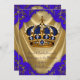 Rico azul real e príncipe dourado convite para batismo com coroa azul e dourada sobre um lindo fundo azul real e espiral dourado de satina. Este convite para batismo de príncipe ouro e azul-ornamentado é facilmente personalizado para o seu evento, adicionando detalhes do seu evento, estilo de fonte, tamanho de fonte e cor e texto.