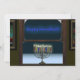 Uma representação de uma menorah tradicional Chanukkah numa janela. A menorah está refletida na janela, há geada no vidro, e neve lá fora.
