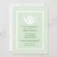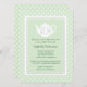 Uma imagem adorável de um bule de chá branco segurando uma garrafa, um bico, e um chocalho convida os convidados para um Chá de fraldas de chá em honra da mamãe ser. Em um fundo de bolinhas azul e branco bebê, a silhueta branca, mas elegante, de um bule de chá adorado com estas essências de bebê faz deste convite um adorável prelúdio para a deliciosa festa de chá que você planejou para a mamãe da sorte.