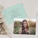 Comemore o formando com nossos convites para festa de formatura de fotos do Sweet Script. Os convites elegantes de festa de formatura exibem a foto do formando com "formando" em uma fonte de script chic que sobrepõe a placa. Personalize a frente dos convites de festa de formatura personalizados adicionando o nome do formando, a escola e o ano de graduação. O verso do convite apresenta um fundo verde da casa da moeda com pontos brancos nos limites de um espaço para os detalhes da sua festa de formatura.