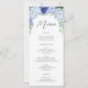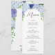 Mostre seu menu delicioso nestas cartas adoráveis - tamanho perfeito para colocar em cada prato! Este design apresenta uma bela fonte de script e lindas drangeas azuis. Edite facilmente os itens de comida!