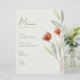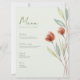 Menu de casamento personalizável com flores vermelhas em aquarela e folhas de sage verde em um fundo verde pálido personalizável.