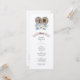 Lindo menu de casamento que faz parte da coleção de casamento Amor Eterno. lindas flores brancas, folhas azuis e tema de coração gravado com monograma rústico.