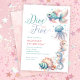 Mergulho rosa em cinco sob o mar A Sereia Aniversário apresenta ilustrações adoráveis de aquarelas de peixes, cavalos marinhos e águas-vivas em tons de púrpura, aqua, lacre e rosa.