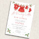 Merry Little Christmas Clothesline Baby Shower. Minimalist style with a set non-editable script for the words “A Merry Little” and easily personalise the rest of the text to your details. A clothesline with festive baby clothes borders the top with holly, berries and snowflakes for a Christmassy touch.