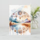 Trabalho de arte de aquarela vibrante com uma paisagem serena com montanhas e um lago calmo no nascer do sol. No primeiro plano estão uma árvore tradicional e uma pequena cabana, cercada por árvores exuberantes. A cena com intrincados padrões tribais, incluindo sonhadores, penas e formas geométricas, incorporando tons de terra quente e efeitos de aquarela suave para melhorar a atmosfera de sonho. O olhar global evoca um sentido de harmonia com a natureza e a cultura do indígenas.