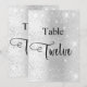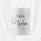 O número da tabela é escrito com um script de estilo elegante com letra manual. Letras negras, um fundo de prata sujo com poeira brilhante falsa, faíscas.